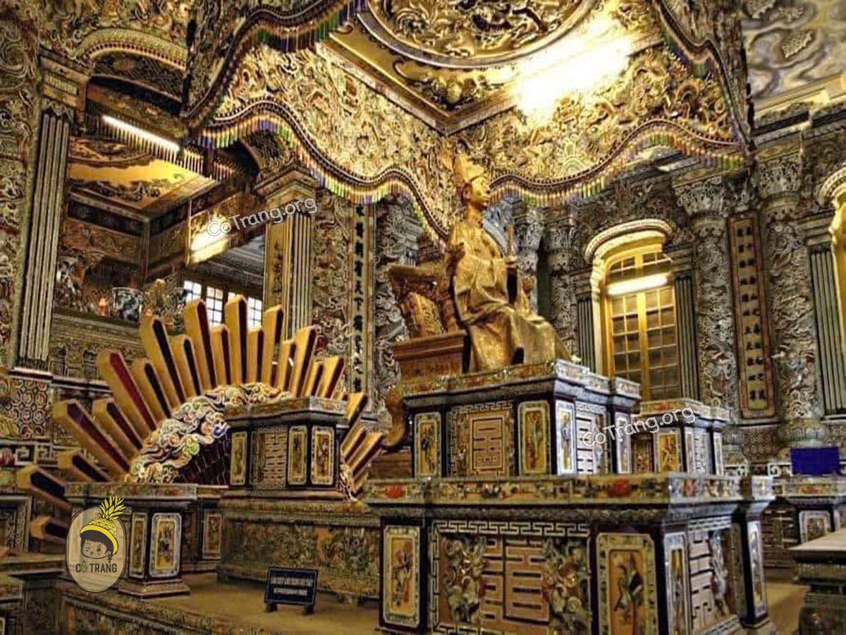 Trần cung điện được trang trí bằng những bức tranh vẽ rồng uyển chuyển đầy nghệ thuật. Bên trong có tượng vua Khải Định bằng đồng, được đúc tại Pháp và đặt trên bệ đá cẩm thạch. Phía sau là bửu táng – nơi đặt thi hài nhà vua dưới lòng đất.