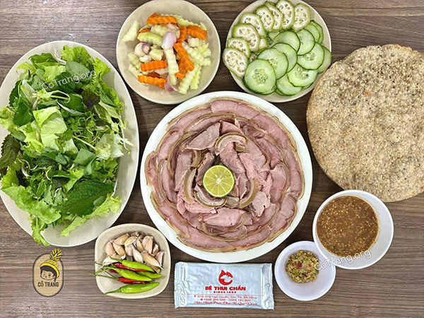 - Ăn kèm rau sống & bánh tráng: Bê thui ngon nhất khi cuốn cùng bánh tráng Đại Lộc, rau sống gồm chuối chát, dưa leo, khế chua, rau thơm, tạo nên hương vị hài hòa, không hề ngấy.