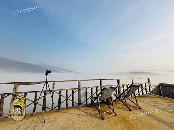 Sân thượng là địa điểm sống ảo tuyệt nhất của Quán. Từ đó, bạn có thể chiêm ngưỡng một bức tranh toàn cảnh hùng vĩ của những dãy núi xung quanh. Vào sáng sớm, biển mây hình thành ở thung lũng bên dưới tạo nên một cảnh tượng hùng vĩ. Xa xa, chúng ta có thể nhìn thấy đỉnh núi Ngọc Lễ và những ngôi nhà nhỏ trên ngọn đồi đối diện ẩn hiện sau một lớp mây dày đặc.