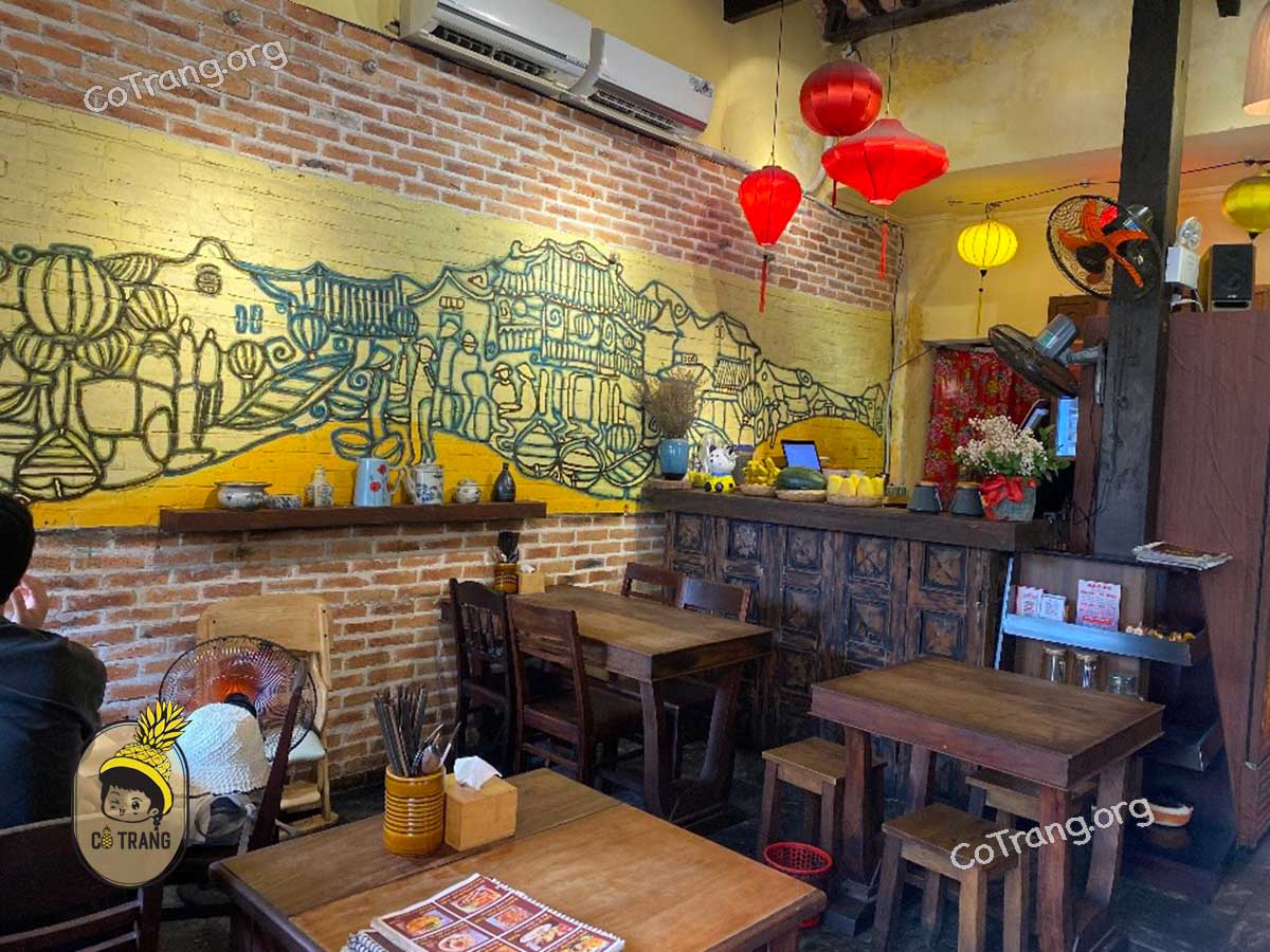 Không gian quán rộng rãi, thoáng đãng được trang trí đẹp mắi với lối kiến trúc mang nét đặc trưng của Hội An. Vẫn sử dụng tone màu vàng nâu làm chủ đạo, được điểm xuyến thêm nhiều chiếc lồng đèn với nhiều họa tiết.