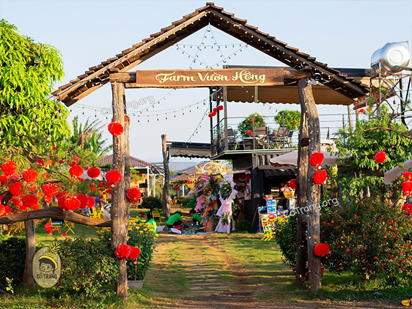 Sở dĩ có tên gọi là Farm Vườn Hồng vì ở đây trồng rất nhiều hoa hồng. Nhiều giống hồng khác nhau, đủ màu sắc từ: Đỏ, hồng, cam, vàng, trắng, xanh lá, tím,… nở quanh năm tạo ra hương thơm ngây ngất cho quán. Từ lối vào bạn đã thấy đủ loại hoa hồng, chúng được trồng từ cổng vào khuôn viên.